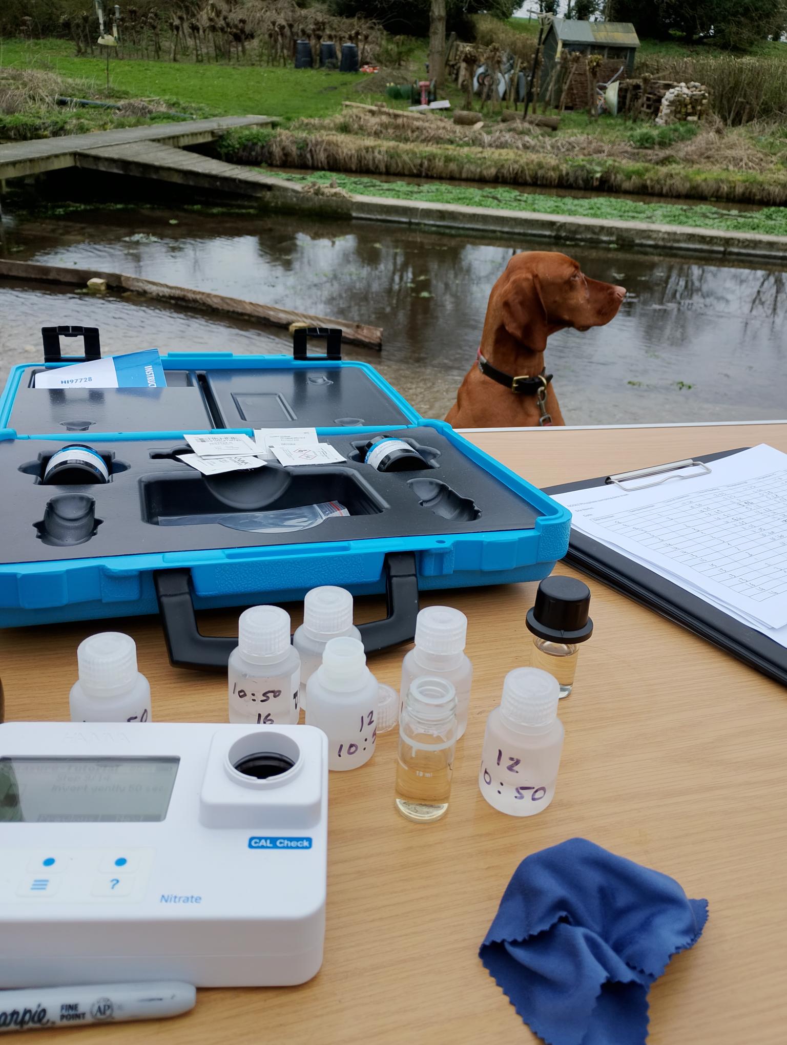It was a lovely day with volunteers heading out to collect water samples from along the river, returning them to our scenic outdoor ‘laboratory’ by the watercress beds where we ran tests on Hanna Nitrate and Phosphate photometers.